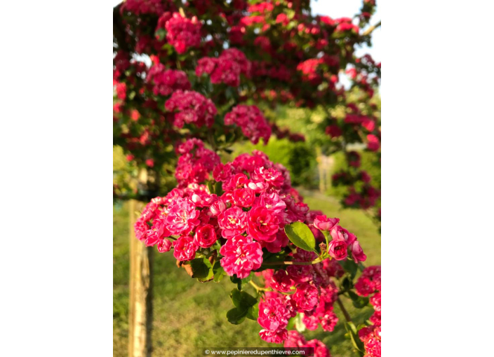 Une variété d'aubépine à la floraison généreuse rouge franc, mellifère et parfumée : excellent choix pour une haie défensive ou libre !