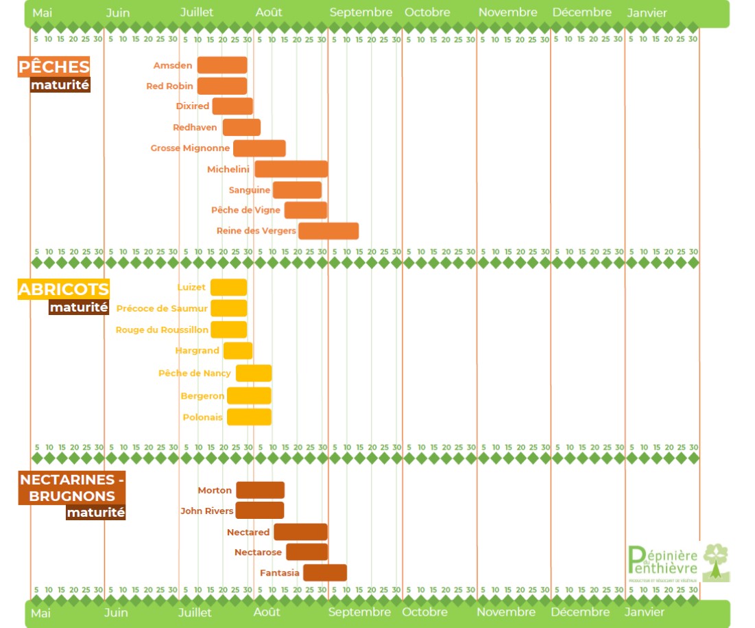 Afin de vous vous aiguiller dans vos différents choix de plantation, nous vous invitons à télécharger et consulter notre infographie "Période de maturité" pour nos pêches, abricots, nectarines et brugnons.