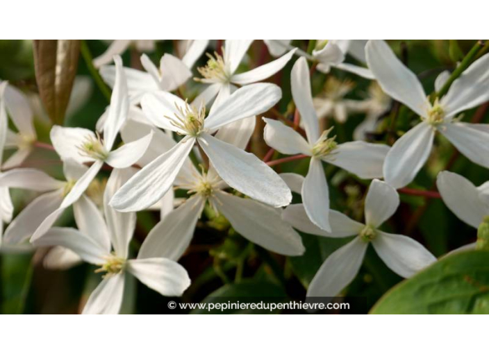 Cette clématite est caractérisée par sa floraison exceptionnelle et légèrement parfumée en sortie d'hiver : cette variété porte des grands bouquets de petites fleurs (8 cm de diamètre) blanc pur, légèrement pointues.