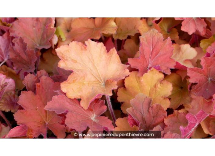 L'HEUCHERA 'Caramel' ou "Heuchère" est une vivace persistante dotée d'une excellente rusticité (jusqu'à -30°C) : cette variété est appréciée pour les couleurs chaudes de son feuillage, jaune orangé à rose pourpre.